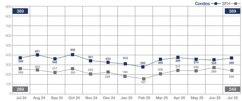 Condominium sales were flat year-over-year, holding steady at 389 units sold in both July 2024 and July 2025. However, year-to-date condo sales show a more noticeable decline—down 5.1% from 2,623 units in the first seven months of 2024 to 2,490 this year.